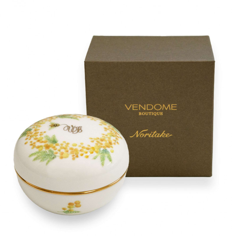 色鮮やかなミモザのアクセサリーとノリタケの“ボンボニエールエがセットになったスペシャルなアイテムです。