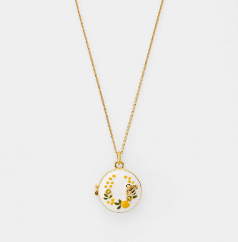 ネックレス、ブローチそれぞれに、『幸せが宿る器』と言われるボンボニエールがセット。ボンボニエールは春を彩るミモザの花と愛らしいミツバチを描いたオリジナルデザインです。