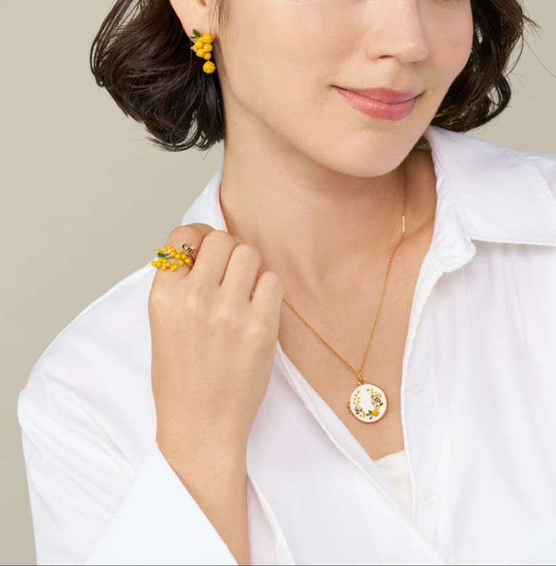 鮮やかなイエローカラーが春の訪れを感じるミモザコレクション。職人が一点一点、丁寧に色付けをして仕上げたミモザのアクセサリーは、まるで本物の花が咲いているかのような可憐なデザインです。