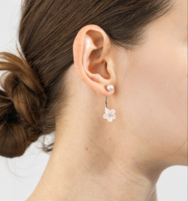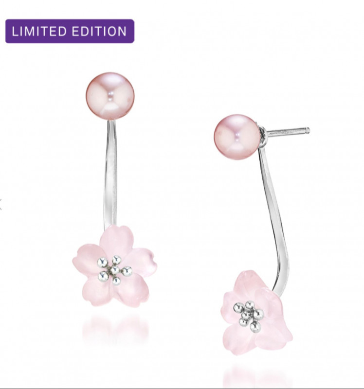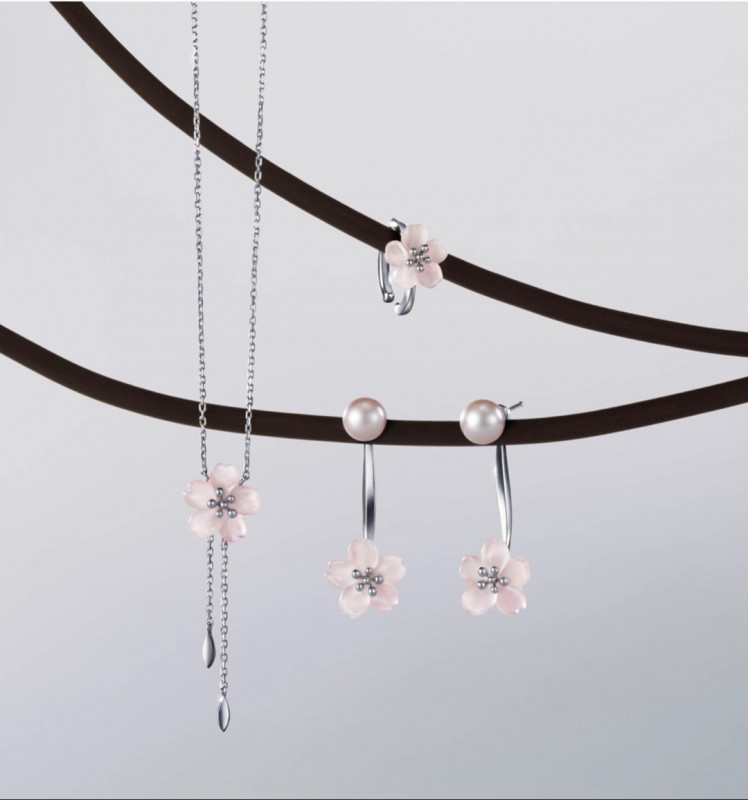 桜の柔らかな花びら一つひとつを繊細に仕上げ、オリジナルカットのフロストローズクォーツが可憐さと上品な華やかさを添えます。