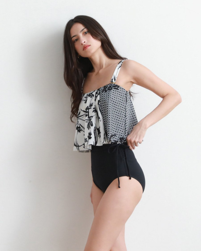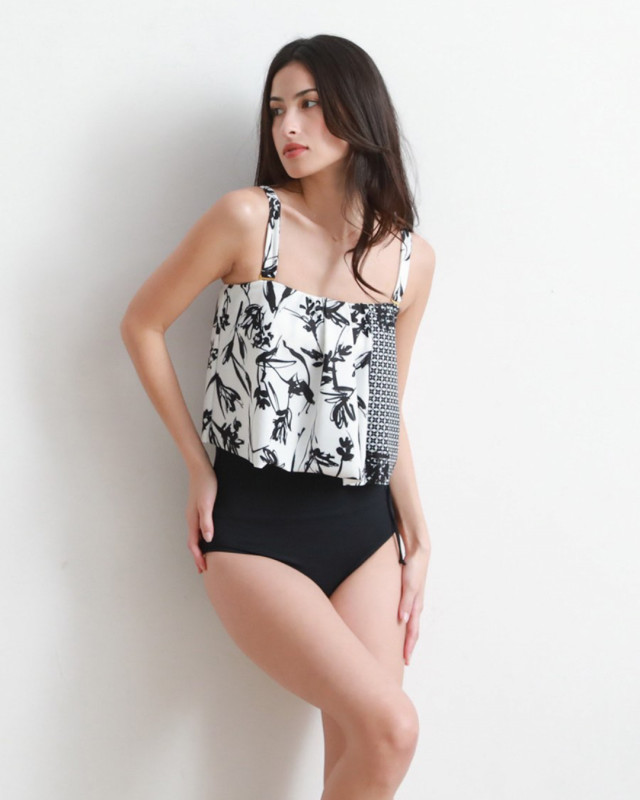 丈の長いフレア水着はバストからウエストラインまでの気になるボディラインを自然にカバー。
