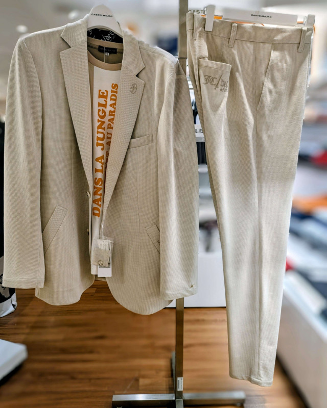 ジャケット、パンツ共にサラッとした肌触りで形状安定に優れシワになりにくいです。