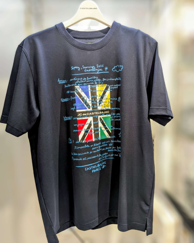 綿ポリの肌触りのいい素材にユニオンジャックと手書きロゴがプリントされています。