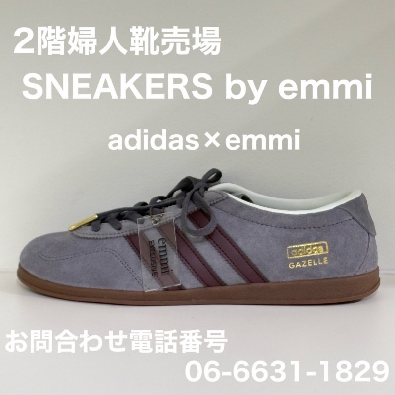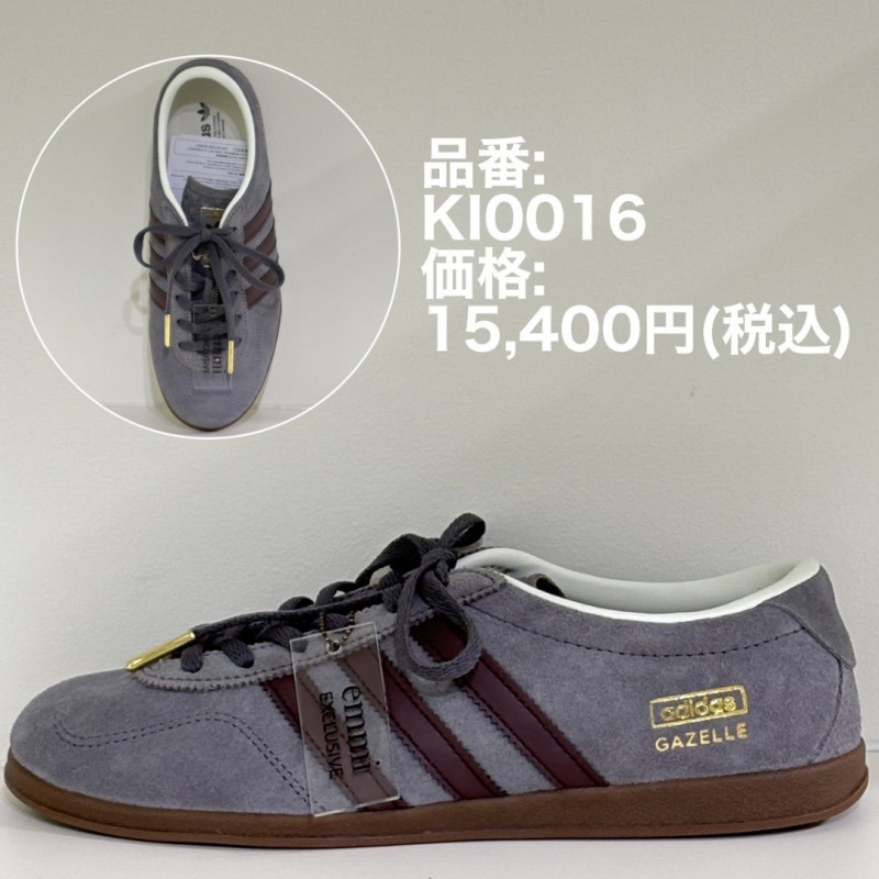 シックなグレーファイブ×ナイトレッドのスリーストライプスがリュクスな印象を誘うカラー&マテリアル別注のemmiらしさ満載のガゼルが到着。