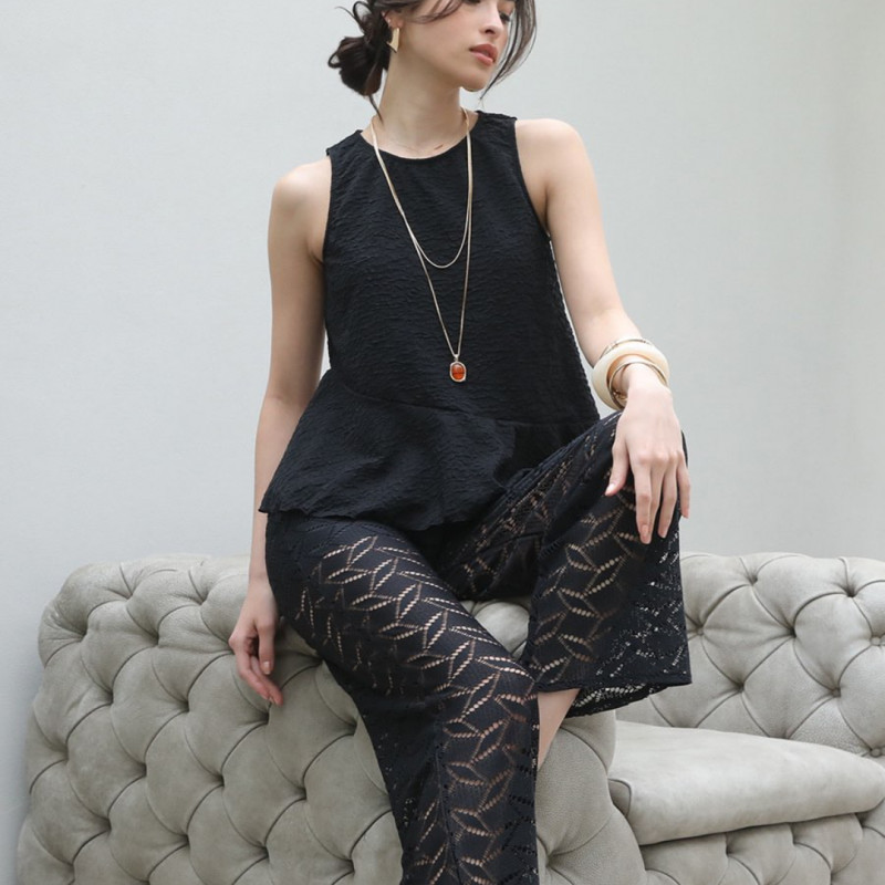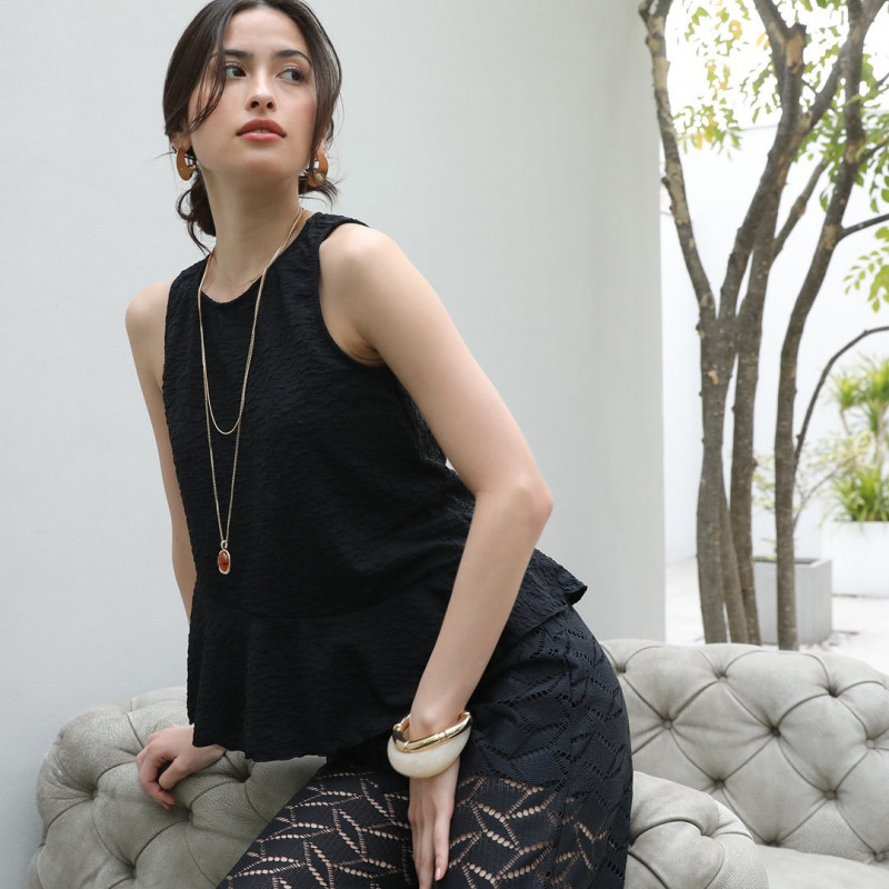 さらに、裾にはペプラムデザインをあしらい、女性らしいシルエットを演出しながら、気になるウエストやお腹まわりもさりげなくカバーしてくれます。