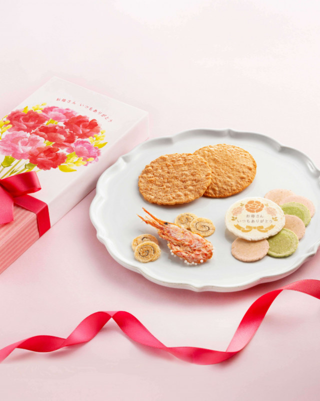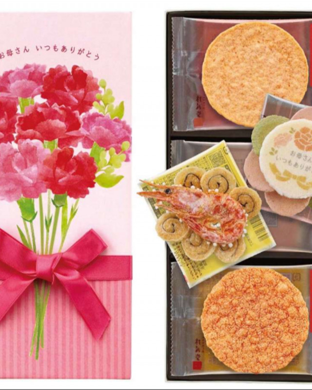 お母さんへの感謝を込めたメッセージ入りのえびせんべいが入った母の日の贈り物にぴったりなお品です💛