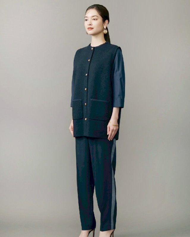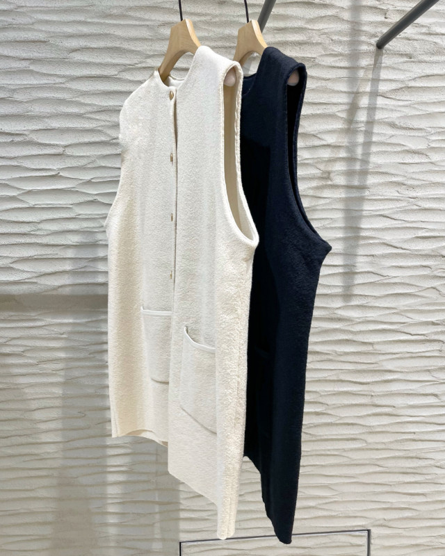 ツイーディーな表情感が秋のスタイリングのポイントになるニットジレです。