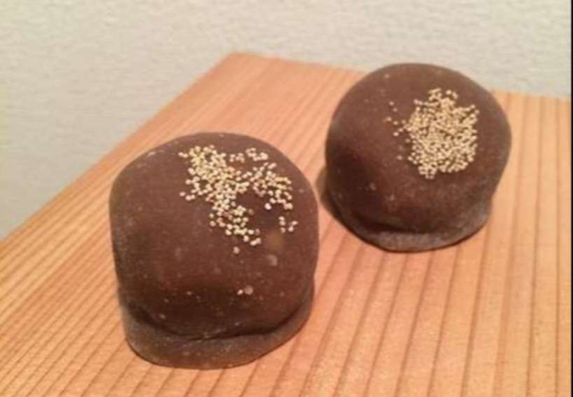 ほんのりと奥深い甘みをもたらす黒糖の茶色い餅生地でこしあんを包みました。表面にはケシの実が散らされています。