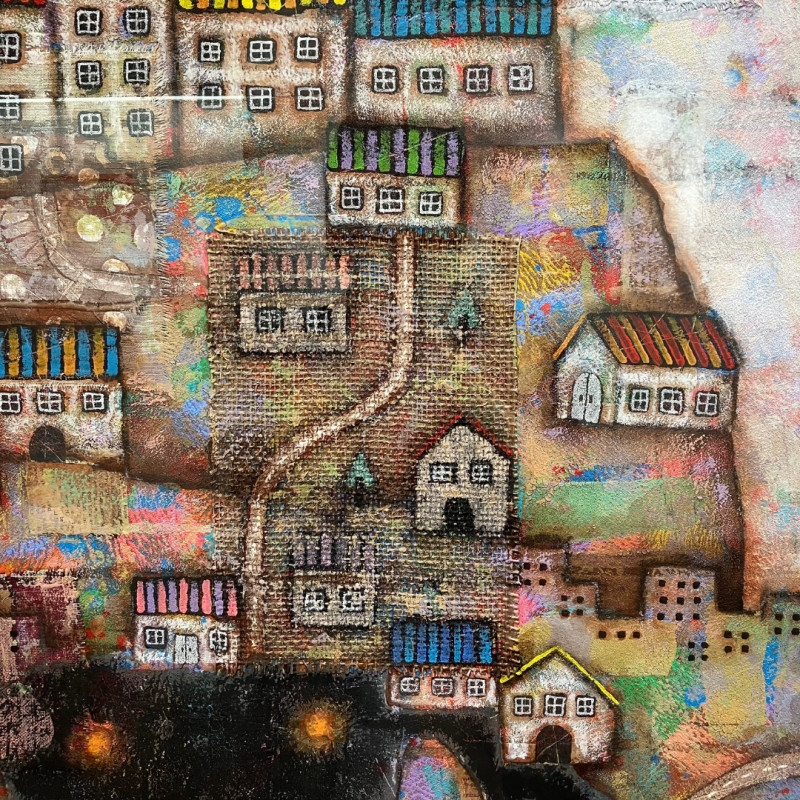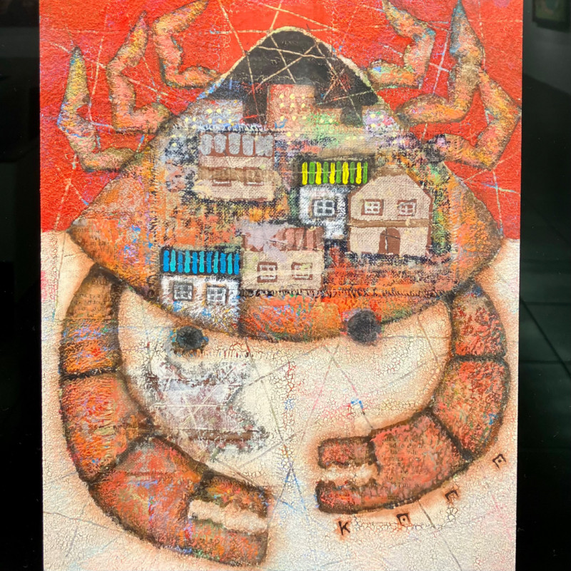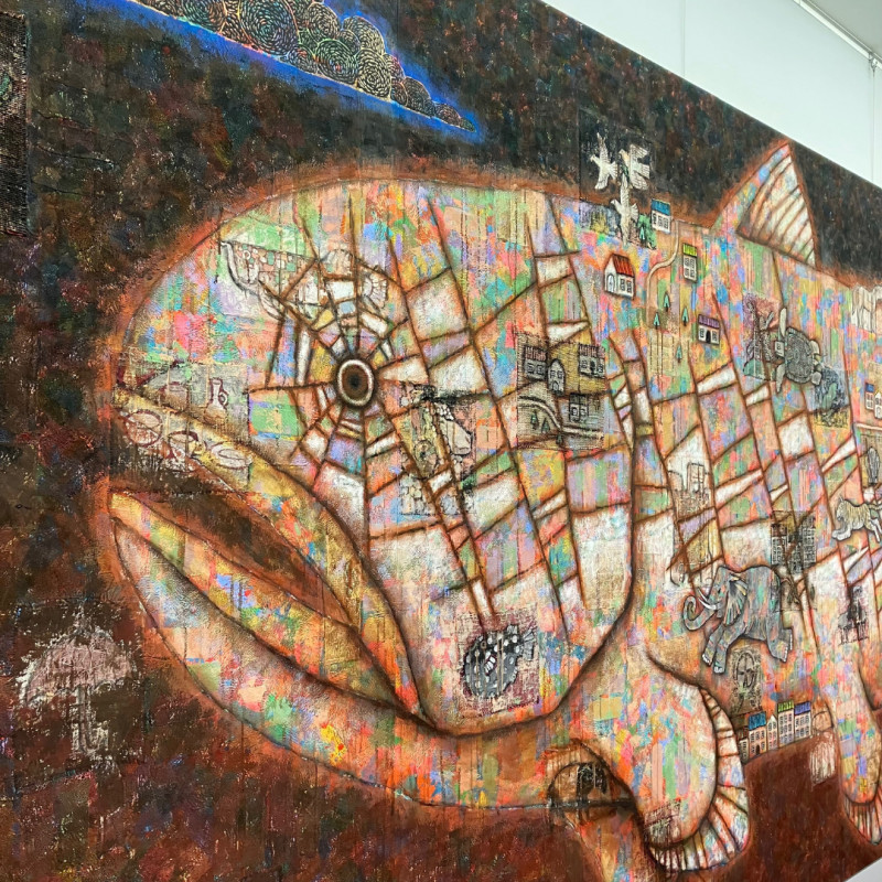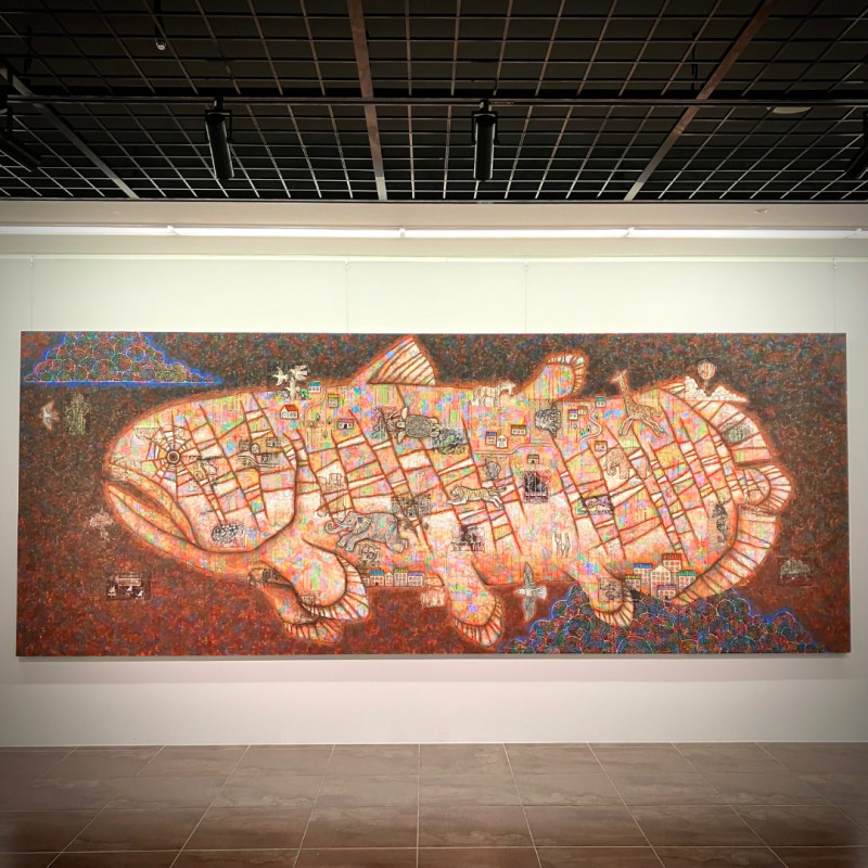 古代魚や狛犬、街など、悠久の時を象徴するモチーフが多く登場し、金丸さんが紡いできた世界を過去から未来へとつなぎます。それらの穏やかながらも豊かな生命感に満ちた佇まいは、作品に潜む物語や時間の層を観る者へ伝え、深い共感を呼び起こします。