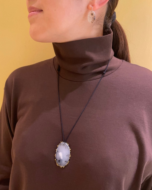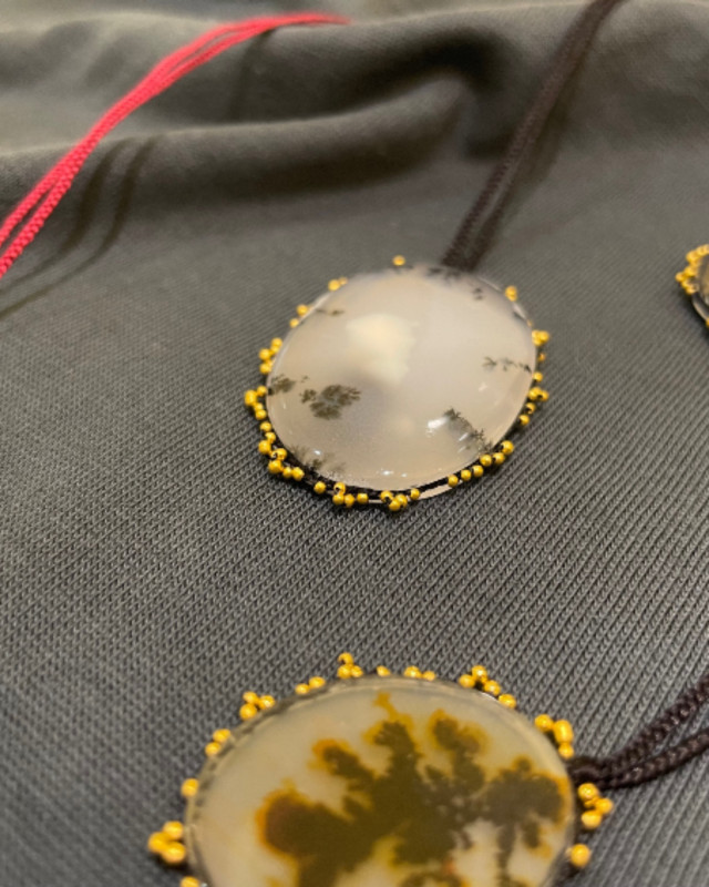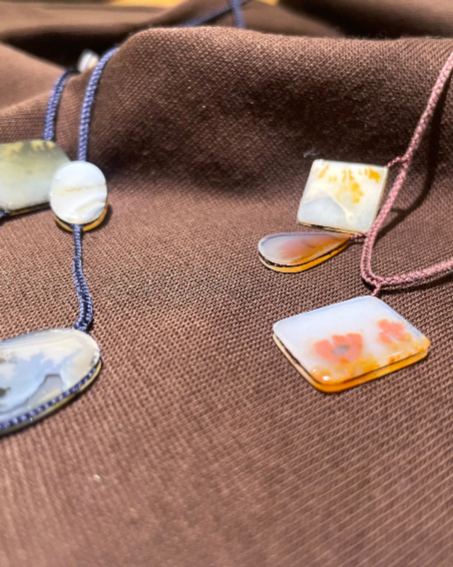 この度、アゲートとオパール2種類の天然石を用い、石の模様に合わせた組紐とともにネックレスとピアスパーツを仕立てました。