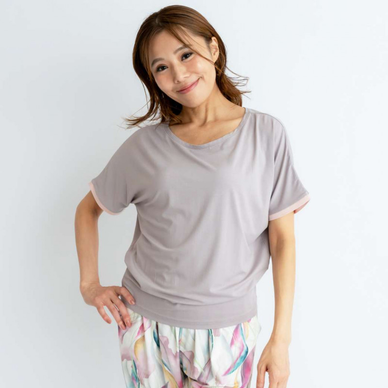二の腕をしっかりカバーする長め丈の半袖トップス。袖には別カラーが付きアクセントに。