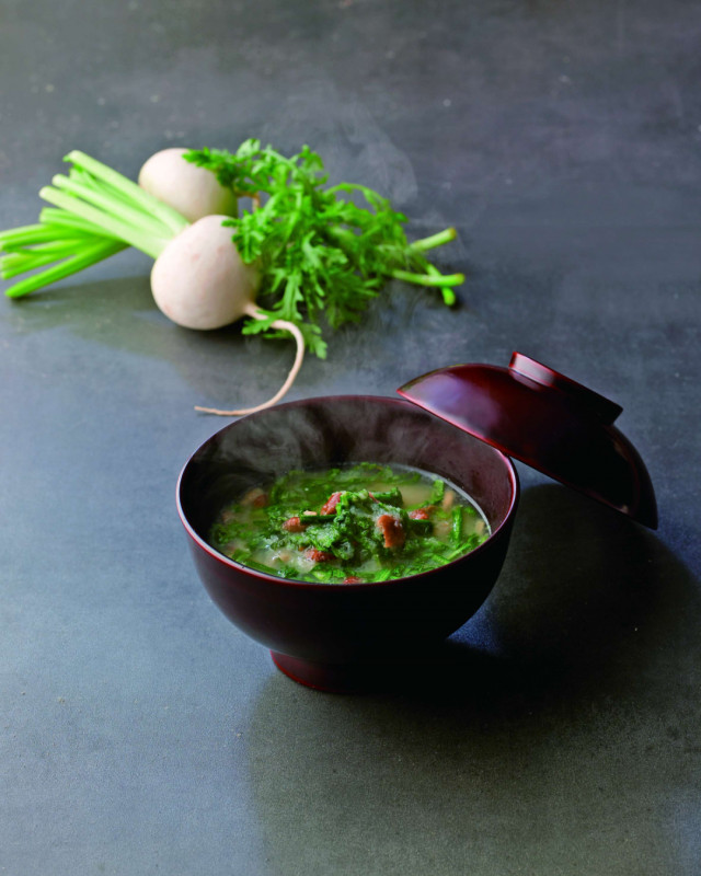 香り豊かな春菊と蕪の味わいを本枯れ鰹節だしで上品にまとめました。御膳に添えても、おもてなし椀にも良い、品のあるおいしさです。