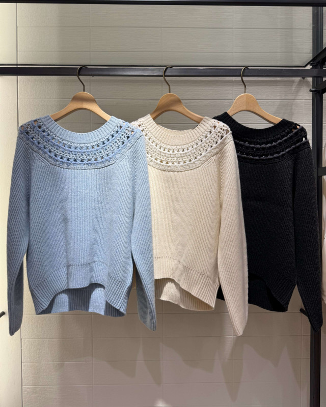表情豊かな糸を組み合わせ、かぎ針編みのような温かみあるクラフト感を演出。