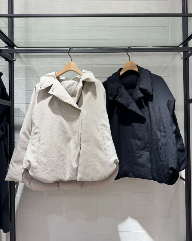 スタンド衿を立てて着ればマニッシュに、前を開ければ軽快な印象に。