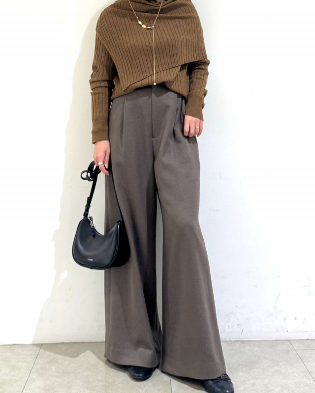 ブラウン系のニットと合わせれば、季節感あふれる上品なスタイリングに。