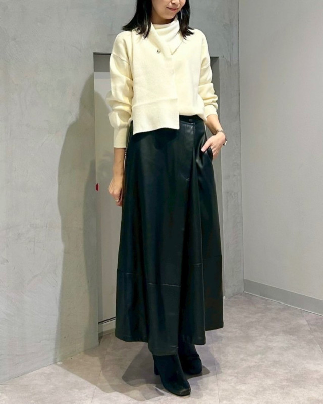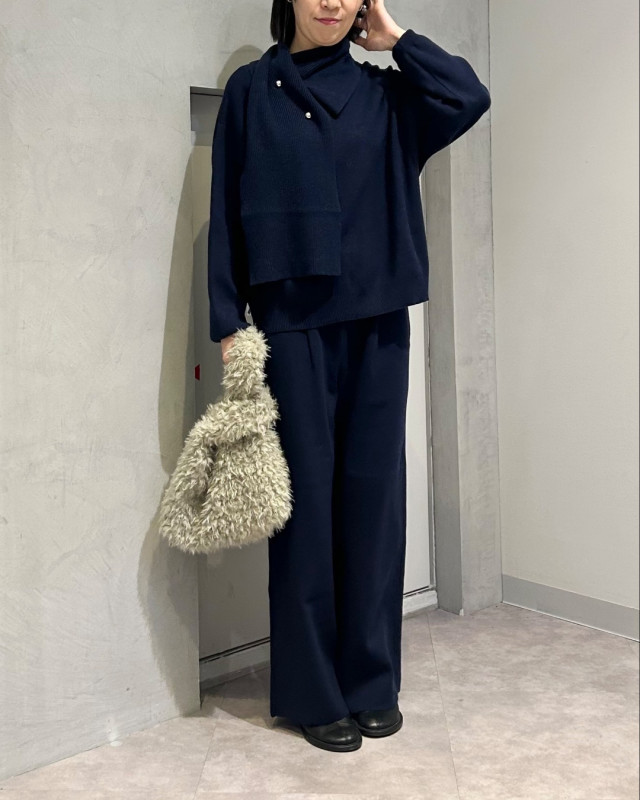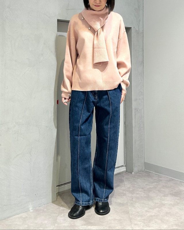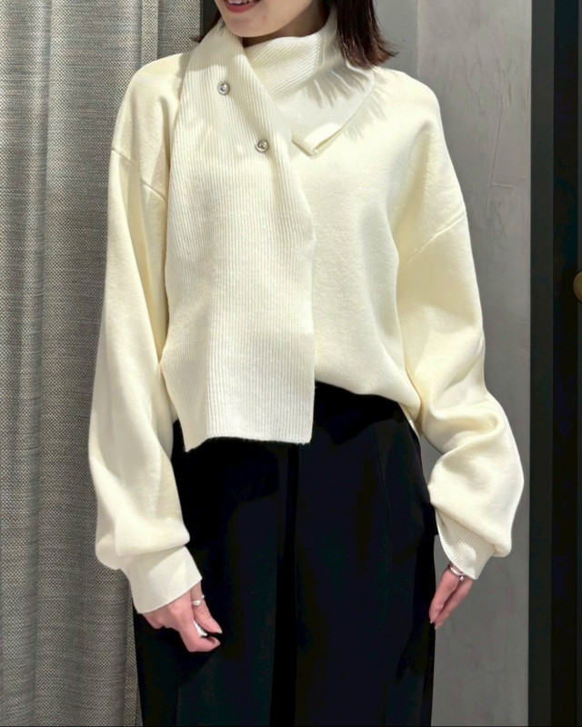 マフラーがドッキングされたデザインニットは、巻き方のアレンジを楽しめる一枚です。