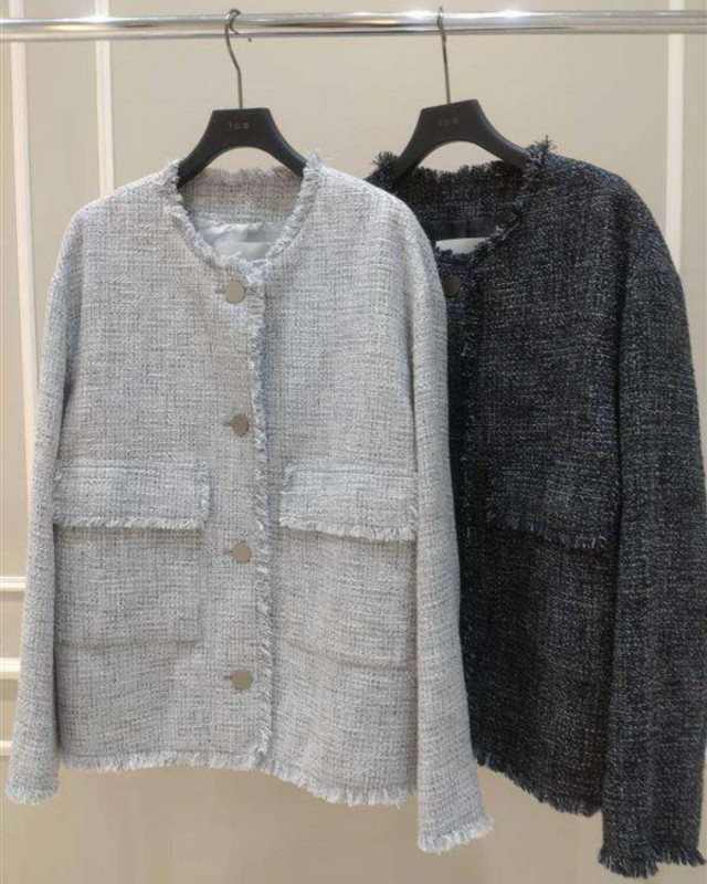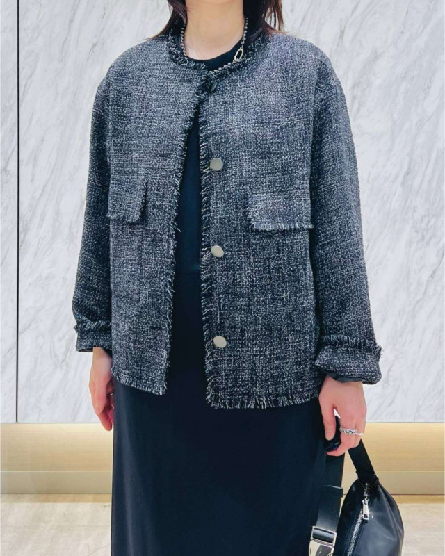 メタルボタン・フリンジがアクセントでカーディガン感覚でお召しいただけるノーカラージャケット♪