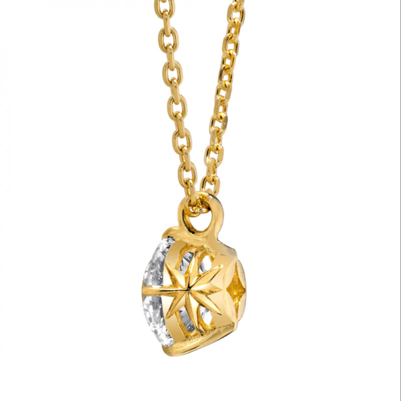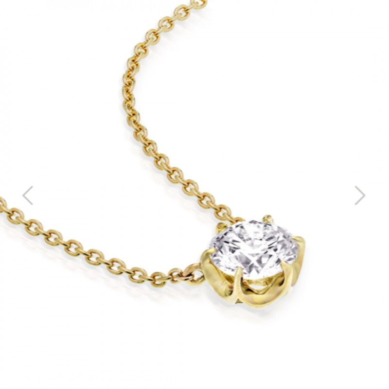 一粒ダイヤモンドの石座にクロッシングスターモチーフをあしらった、スタージュエリーオリジナルの"CROSSING STAR SETTING"ネックレス(画像7.8枚目)は、爪が4つのチェインスルータイプ。