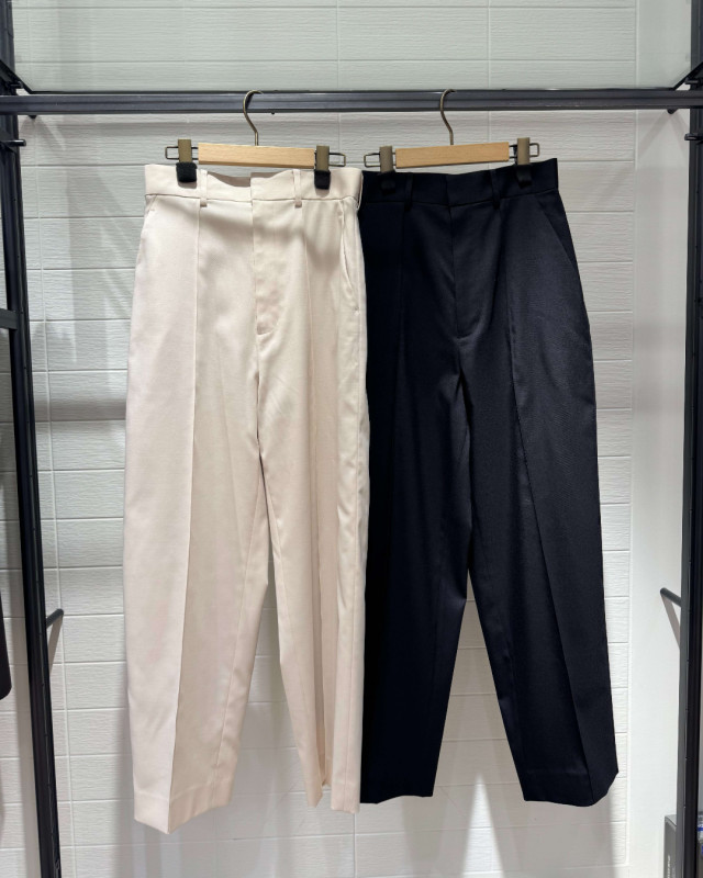 ハリ感のあるTWツイル素材を使用した、シャープな印象のピンタックパンツ。