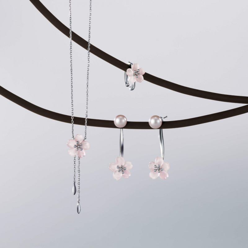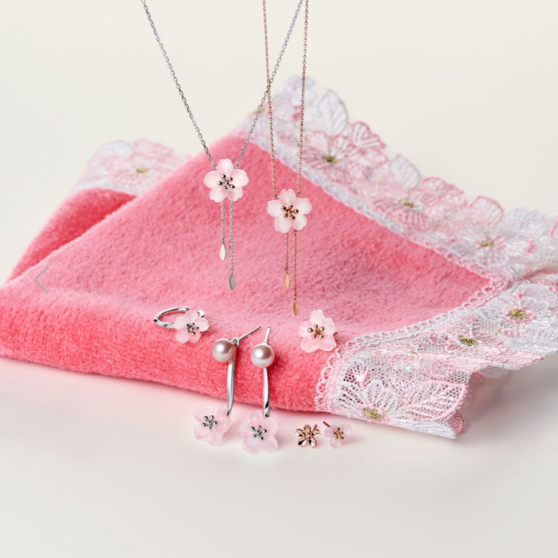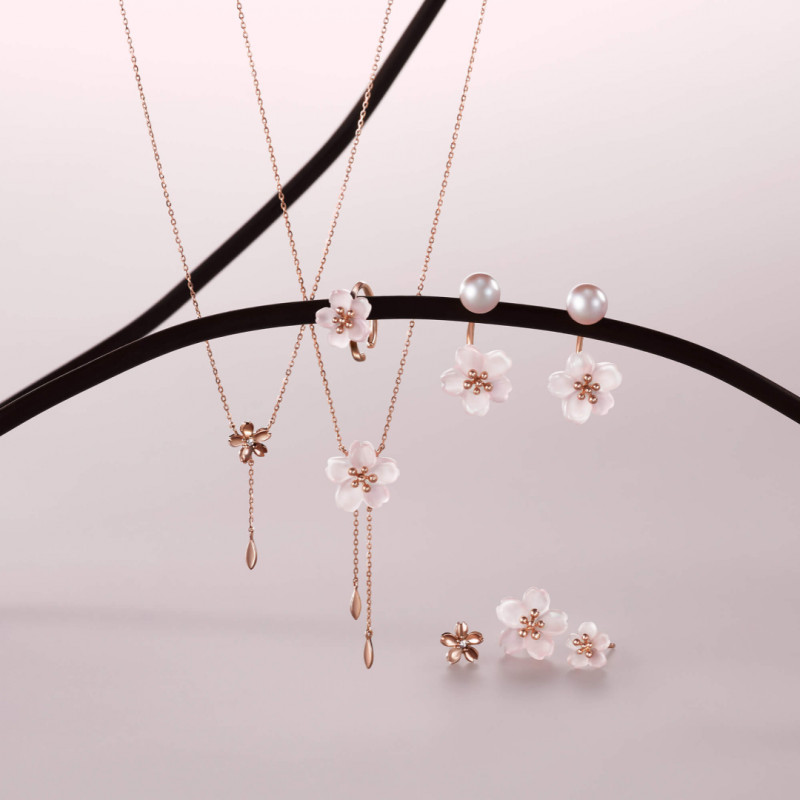 センターに細やかなディティールを施した地金が立体感を生む、 淡いピンク色が優美なローズクォーツとサクラパールで表現された桜や、ローズゴールドで象られた花の中央に希少なピンクダイヤモンドを留めたデザインは、どれも儚くも美しい春の情景を映し出します。