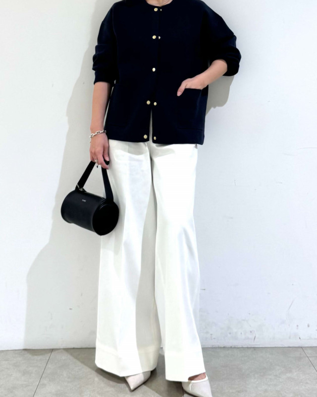 シンプルなトップスに羽織るだけで、清潔感のある軽やかな春コーデが完成。