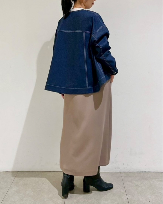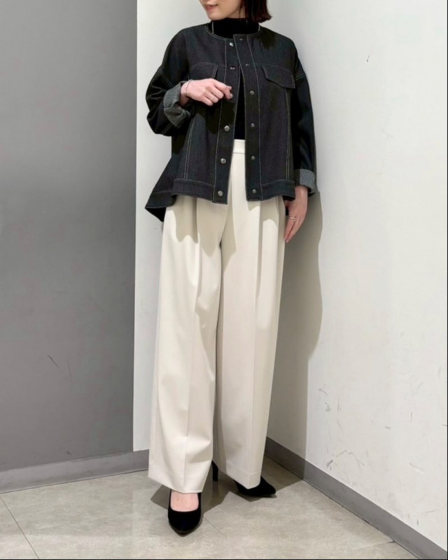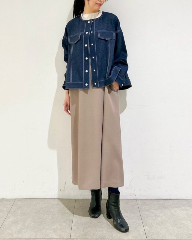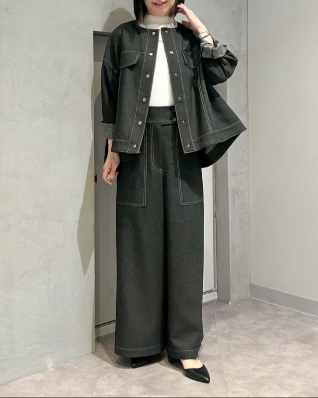 デニム見えする素材ながら、きれいめな印象で大人の着こなしを楽しめる一着です。