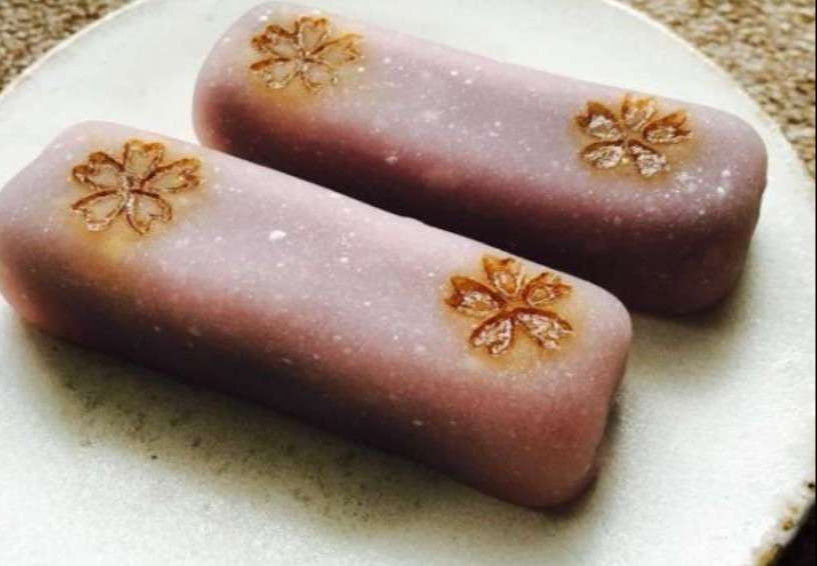 餅生地で筏の形に似せて細長く形作り、ほのかな薄紅色に染めてこしあんを包んでいます。
