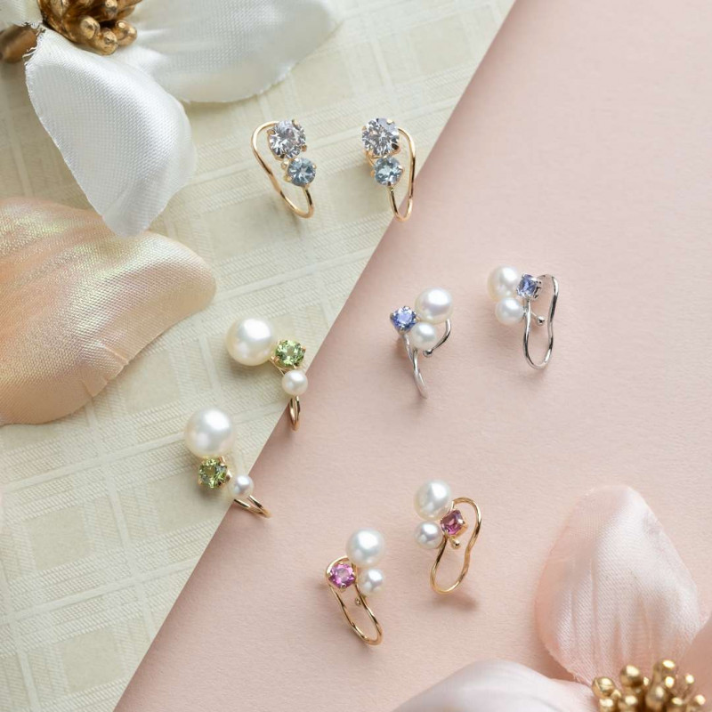 上品な艶めきのパールと天然石をぎゅっと集めてセッティングしたデザインは、WGのタンザナイトとYGのピンクトルマリンの色違いでお楽しみいただけます💖