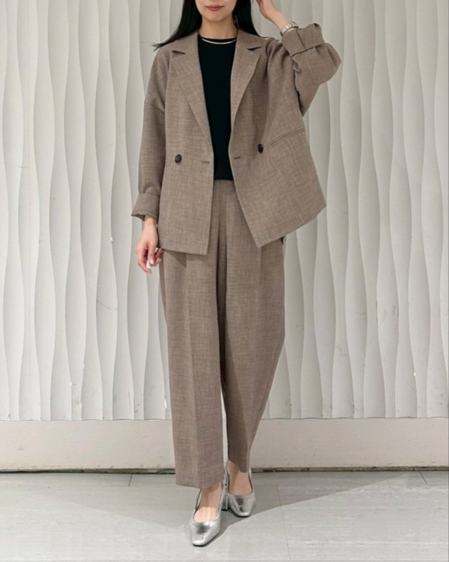 パンツはタック入りのセミワイドシルエットで、脚のラインをすっきりときれいに見せてくれるデザイン。