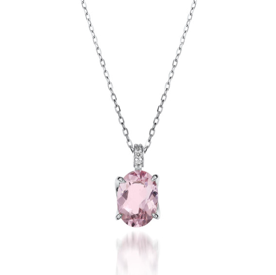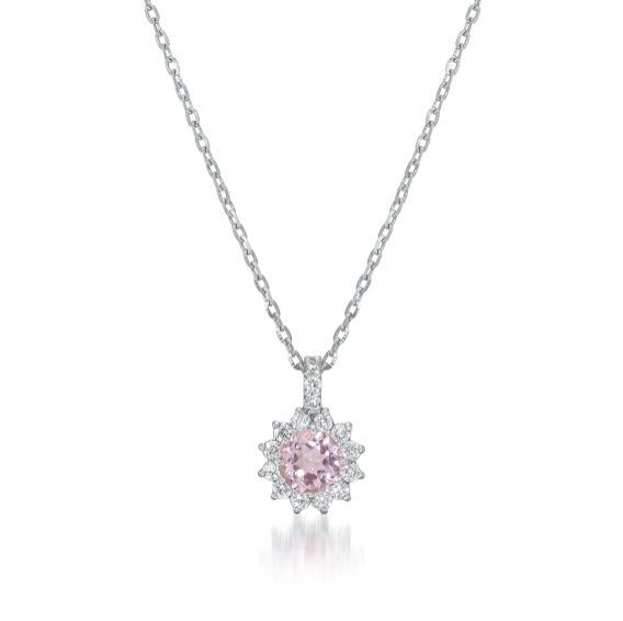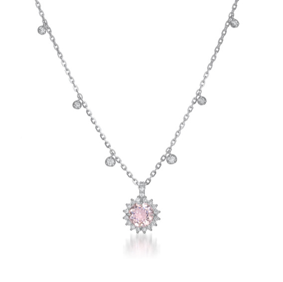 花が芽吹く情景を想起させるブロッサムカラーにちなんで、柔らかなピンクモルガナイトを主役に、メインストーンをダイヤモンドで取り巻いたネックレス。