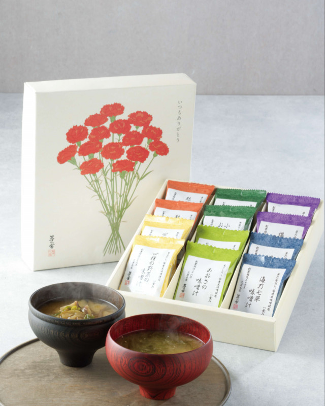 人気のお湯をかけるだけのフリーズドライ味噌汁ギフトを、母の日限定箱に詰め合わせました。