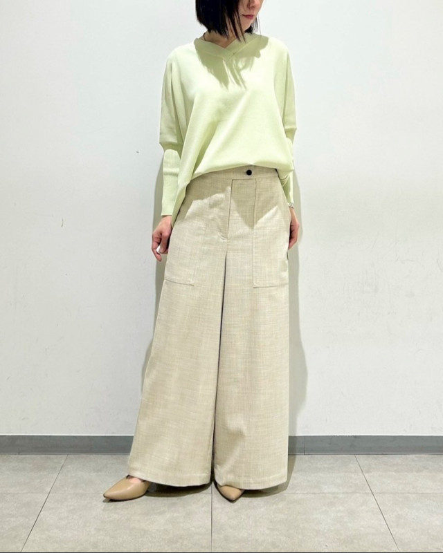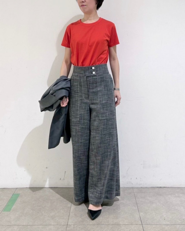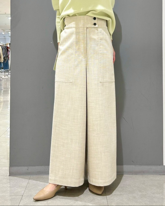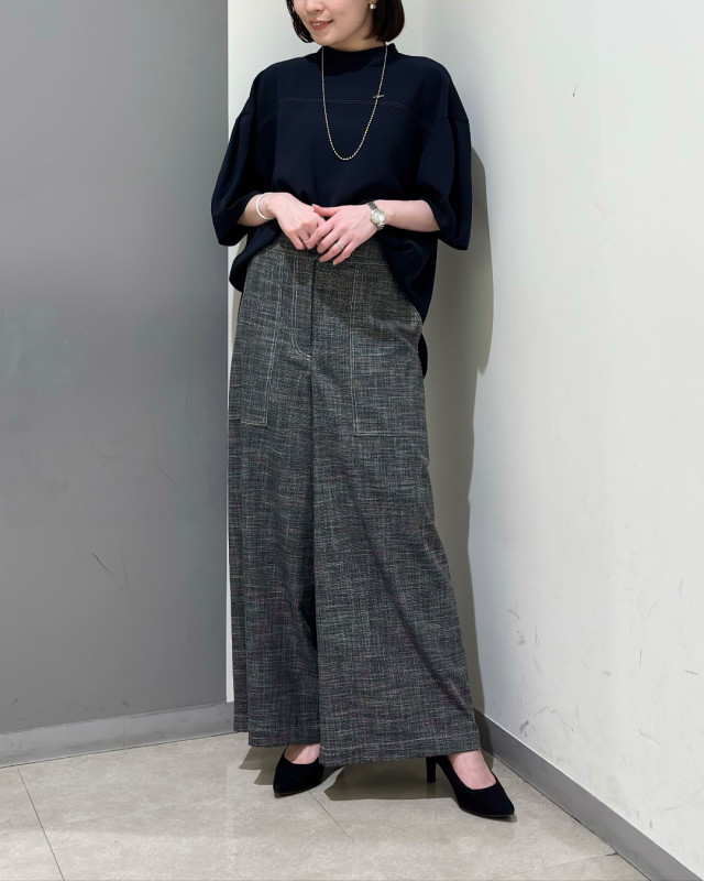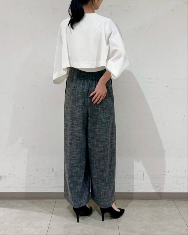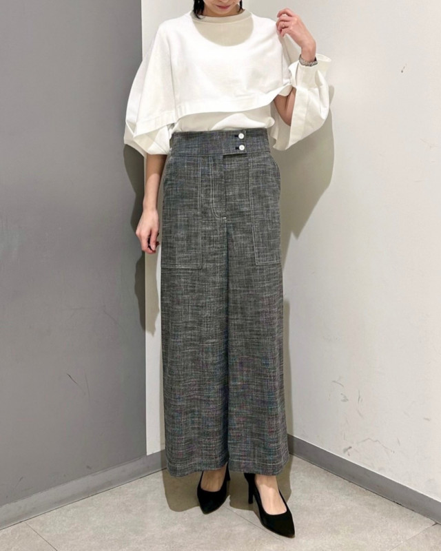 程よく落ち感のある素材で、すっきりとしたシルエットが魅力のセミワイドパンツ。