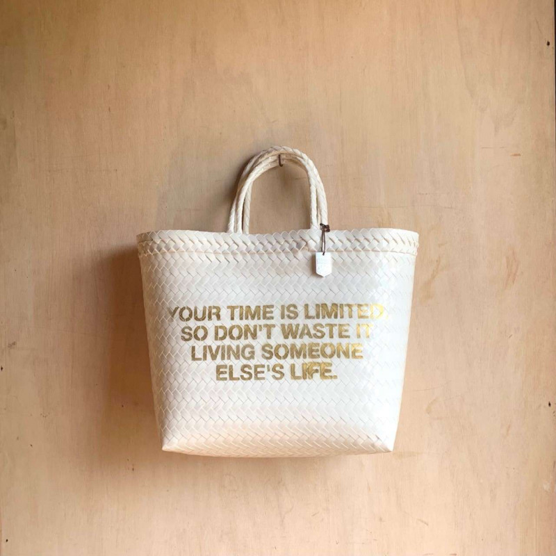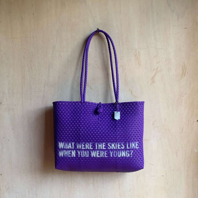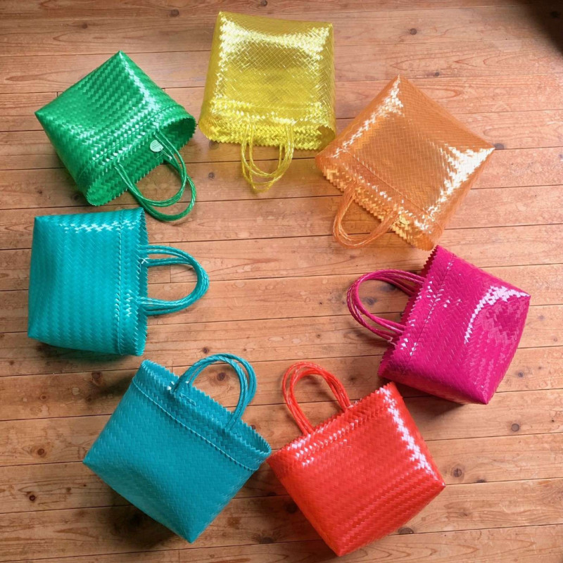 リサイクルテープを手編みしたカラフルなカゴバッグ。