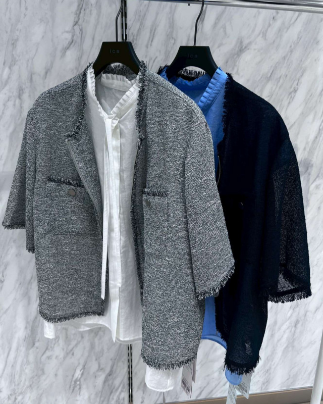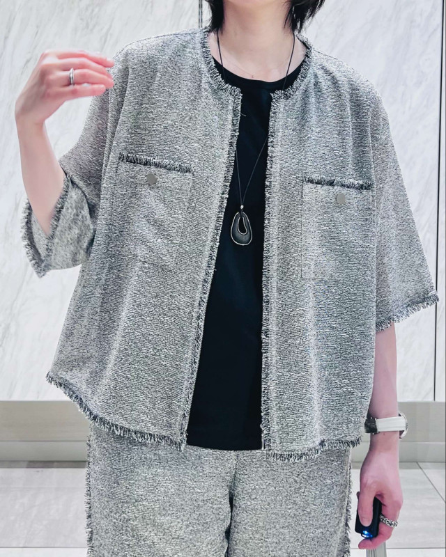 清涼感のある素材で軽やかな半袖ジャケットは、フリンジディティールと胸ポケットのメタルボタンがポイントになっております♪