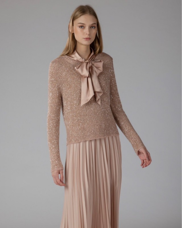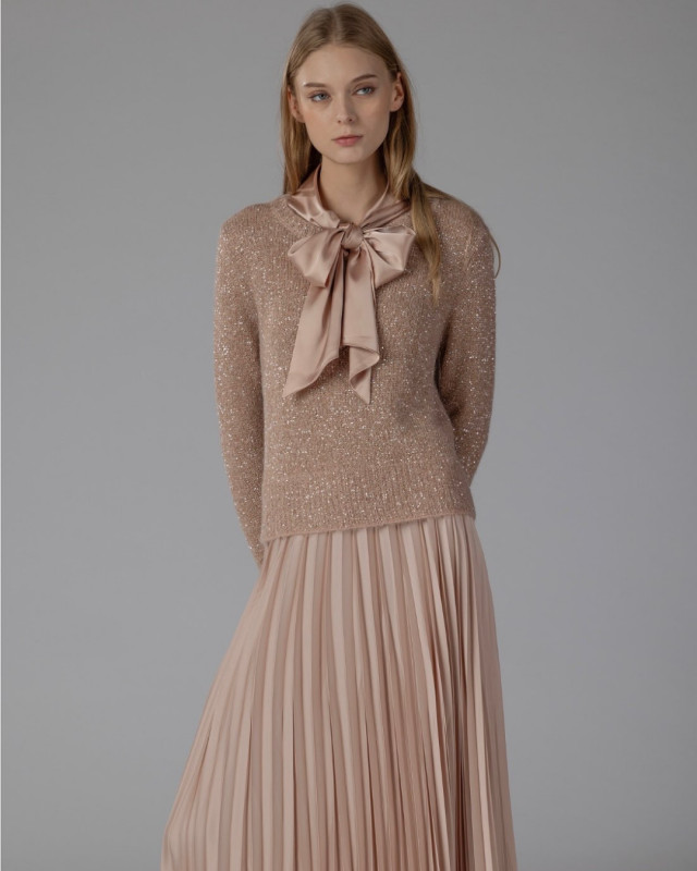 リボン付きのニットは、クラシカルな華やぎを添えつつフェミニンな印象に。