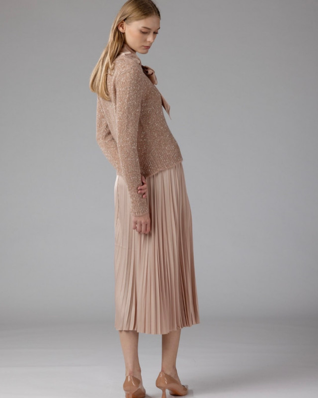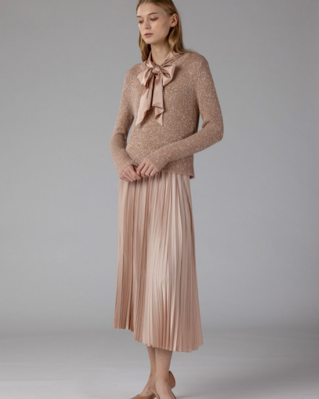光沢感のあるスカートと合わせることで、動くたびに表情豊かな揺れ感を演出します。