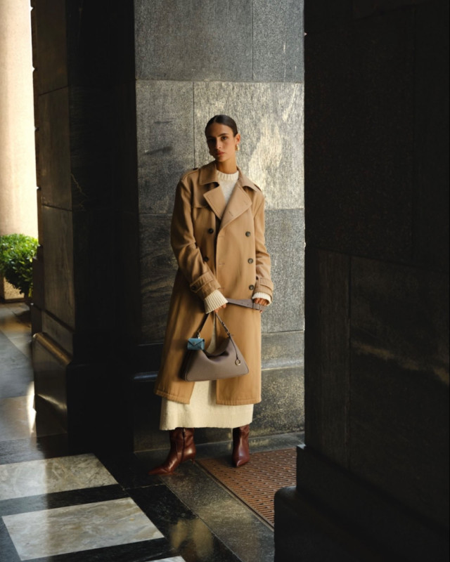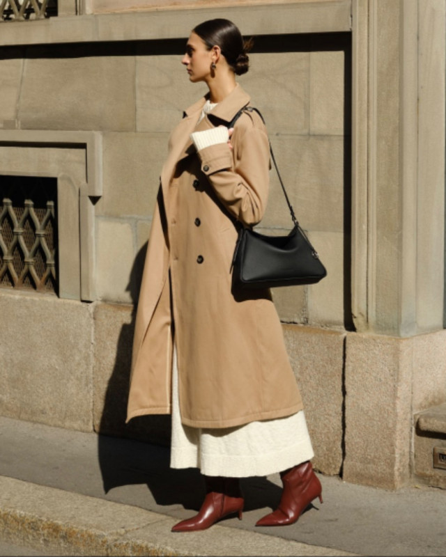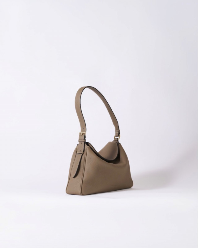 軽量で心地よいシュリンクレザーの風合いと、トレンドに左右されないシンプルなフォルムが特徴的なショルダーバッグ。