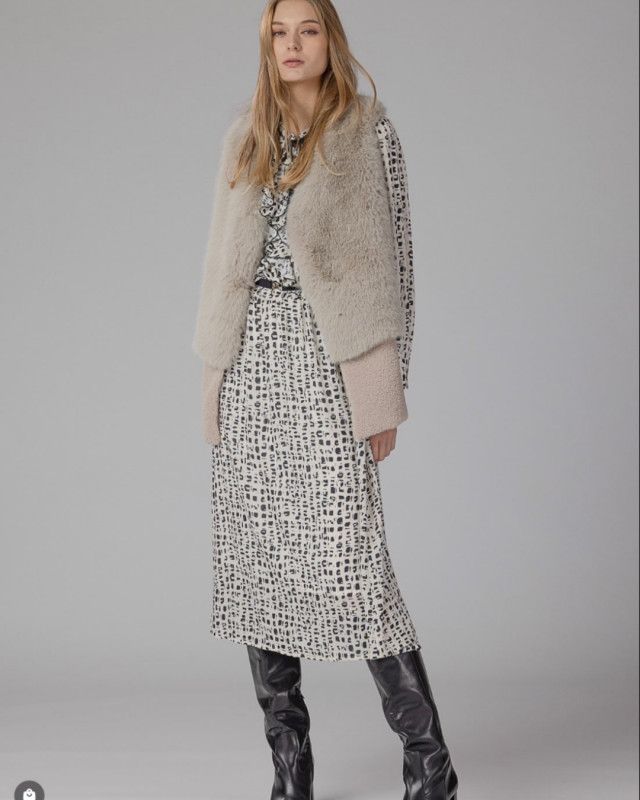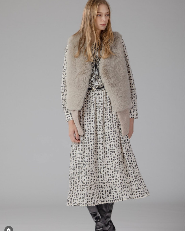 ふんわりとしたファーベストが上品な華やかさを添える、洗練されたレイヤードスタイルです。