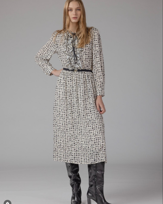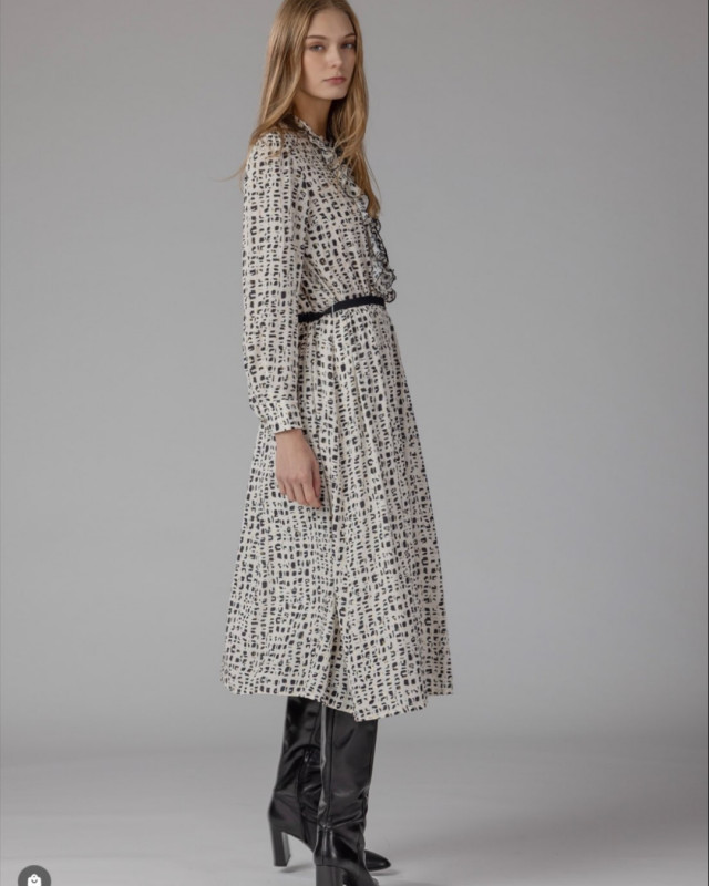 動きのあるプリントワンピースに、優しいベージュトーンを重ねることで柔らかな印象に。