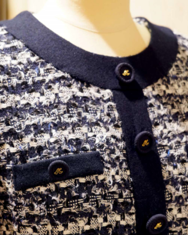 さまざまな意匠糸が丁寧に織り込まれた生地に、Kボタンでオリジナリティーをプラスしました。