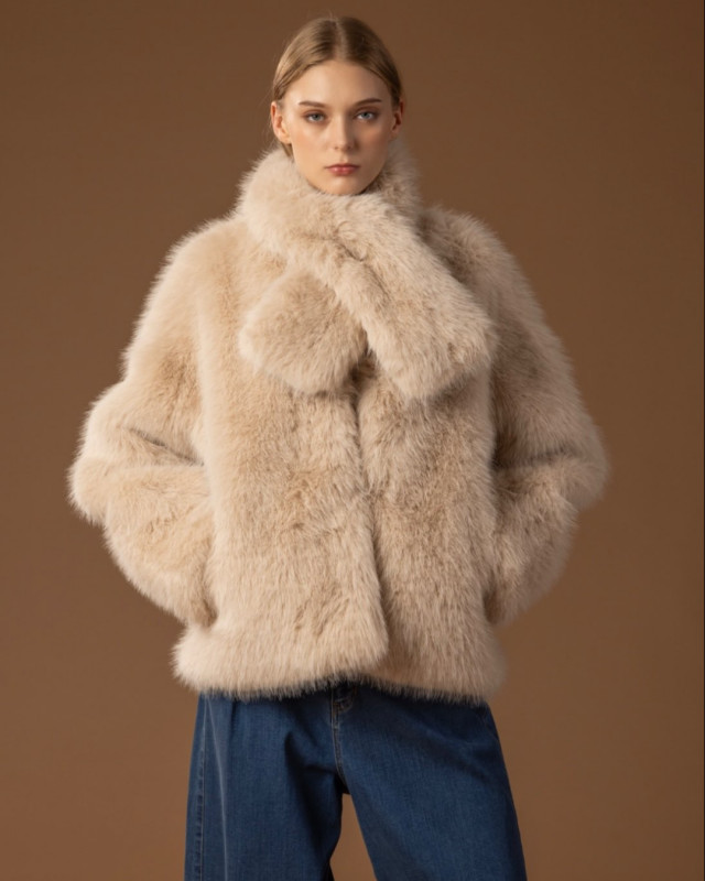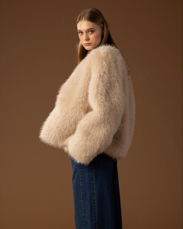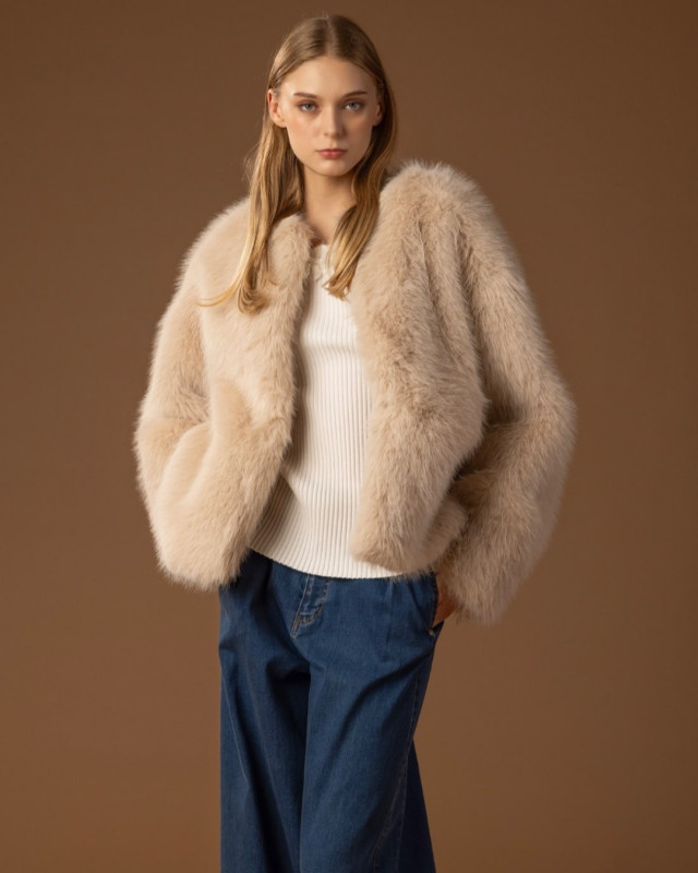 ふんわりとした毛足が華やかさを引き立てる、上質感漂うファージャケットです。