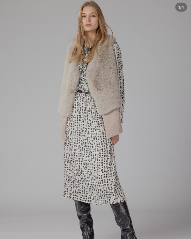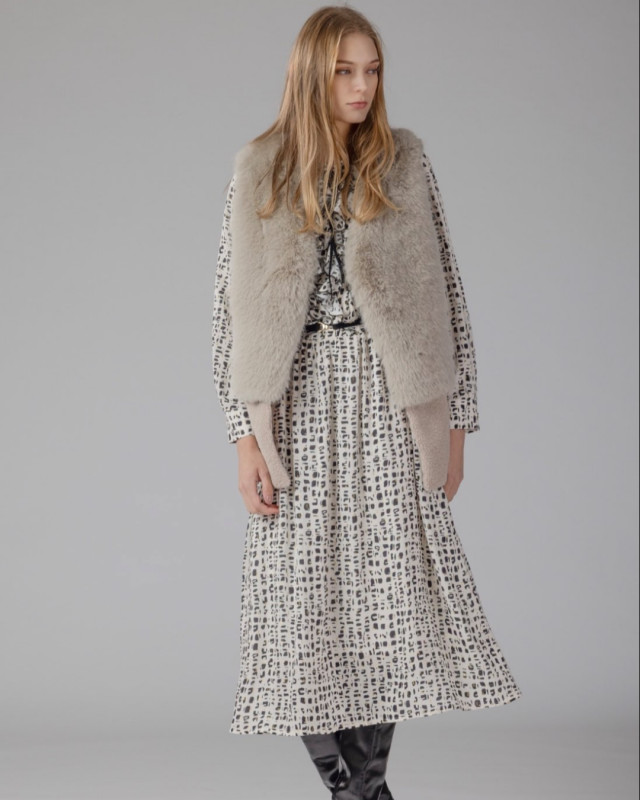 ふんわりとしたファーベストが上品な華やかさを添える、洗練されたレイヤードスタイルです。