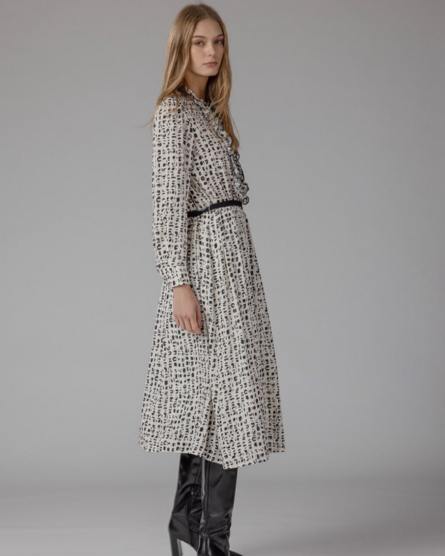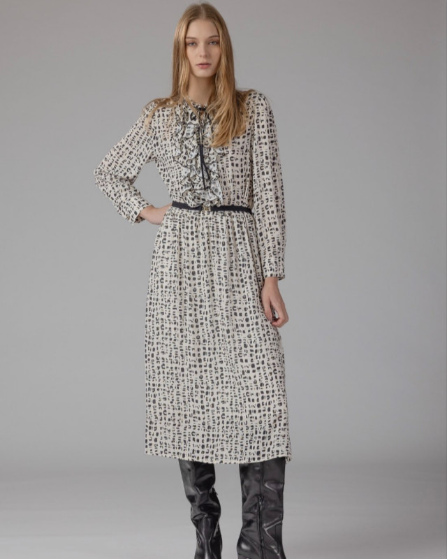 動きのあるプリントワンピースに、優しいベージュトーンを重ねることで柔らかな印象に。