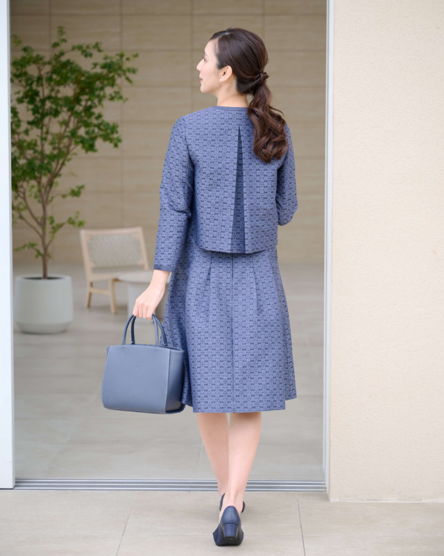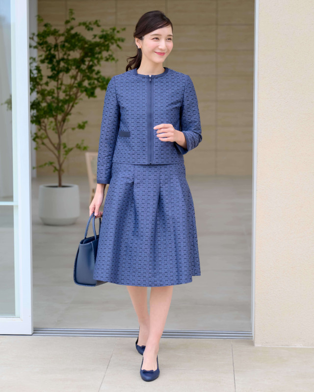 バッグのモチーフをお花に見立てたオリジナル素材がポイントのジップアップジャケット。首元は顔回りをすっきり見せてくれるノーカラー。背中側のタックがさり気ないアクセントになっています。オケージョンやビジネスはもちろん、カジュアルスタイルまで、幅広くお使いいただけます。同素材のスカート(KH0825)とのセットアップもおすすめです。
