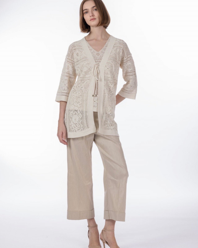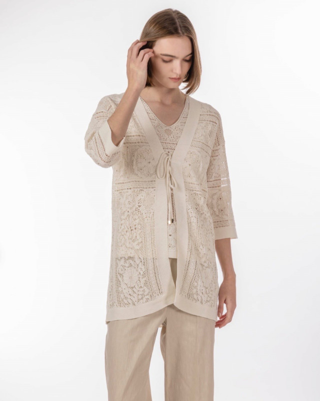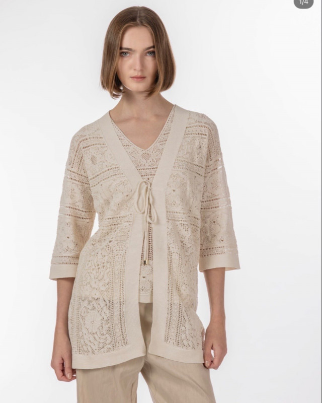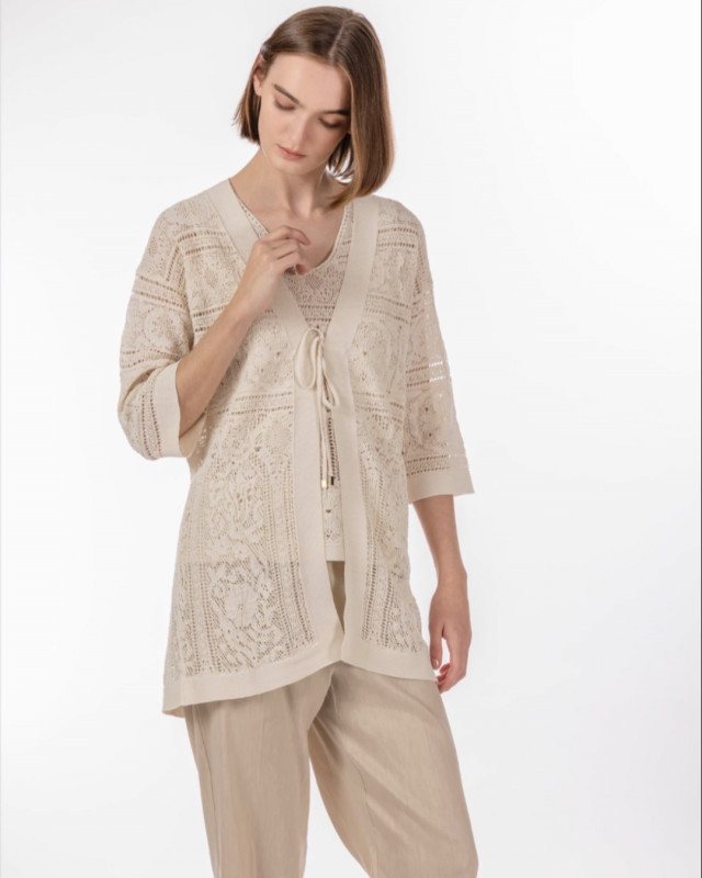 繊細なレースのノースリーブトップスに同素材の軽やかなボレロを重ねた、優雅で女性らしいコーディネートです。