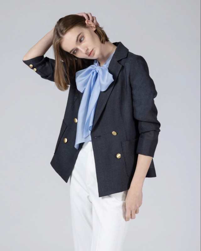 ゴールドボタンのアクセントが程よい華やぎを添え、