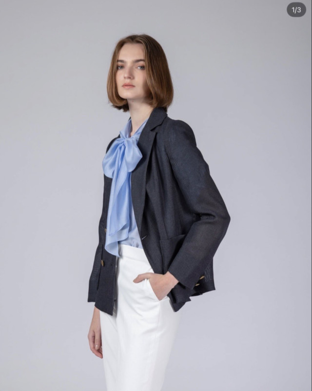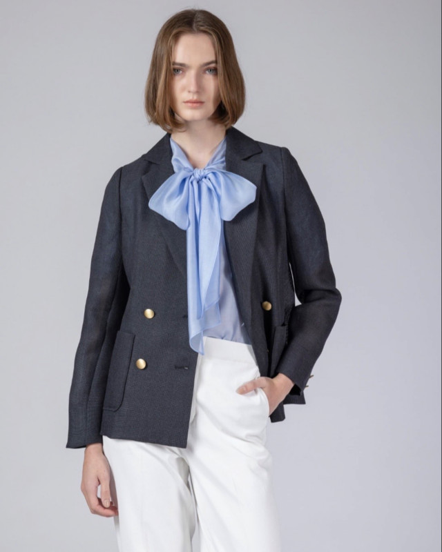 やわらかなブルーのボウタイブラウスを合わせた上品なスタイリング。