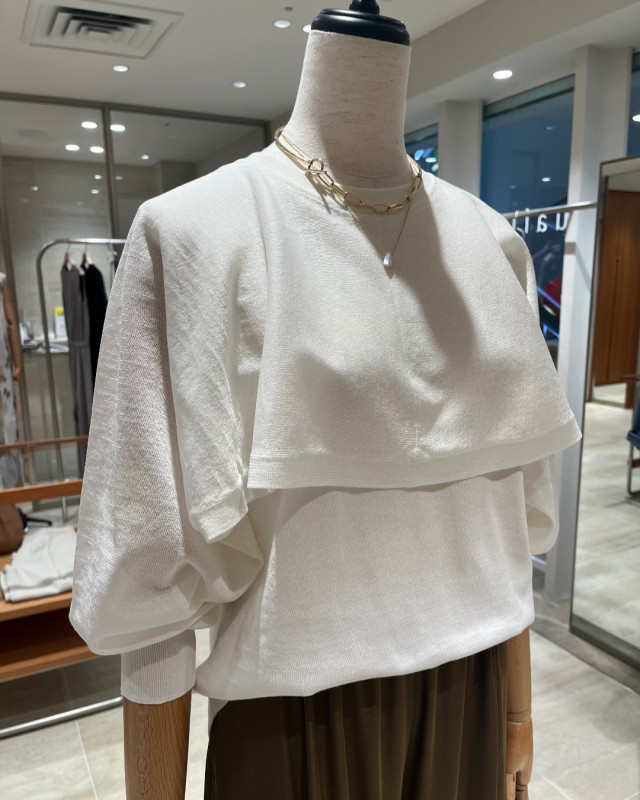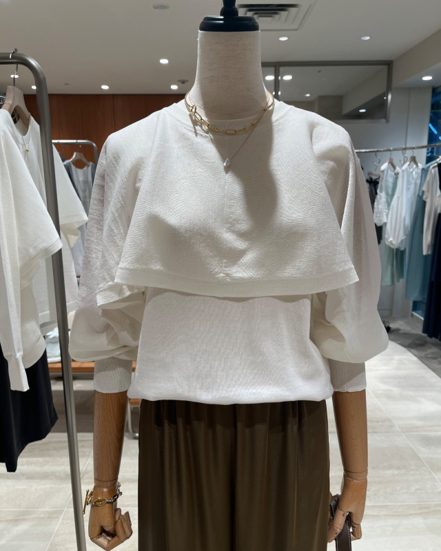 ノースリーブタンクにシアーケープ袖を重ねた、軽やかなレイヤードデザイン。
