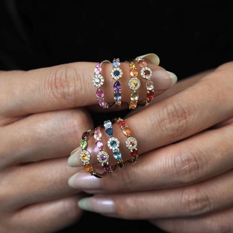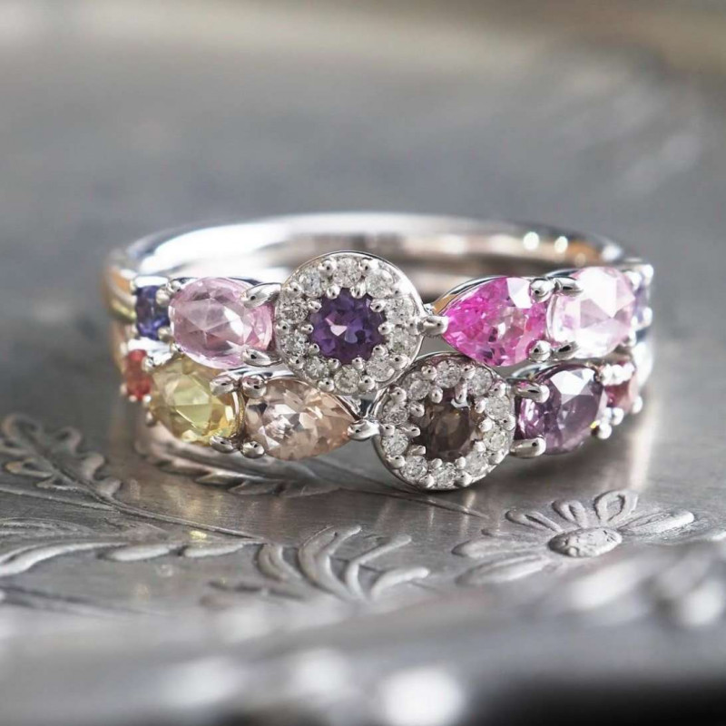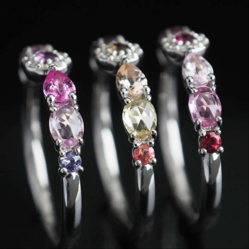 異なるシェイプの石を一本のリングに調和させた、左右非対称のデザインは、自然のゆらぎを表すかのよう。