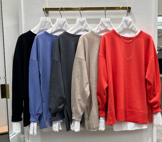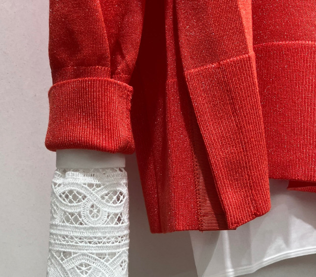 ニットのインナーにレースカットソーを入れて、華やかさをプラスしました。